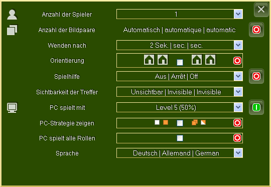 Sichtbarkeit der Treffer. Gefundene Bildpaare können ganz, teilweise oder nicht sichtbar sein. Auch während des Spiels ist ein Umschalten möglich.