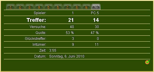 Statistik. In der Statistik werden während des Spiels die Versuche, Treffer, Quote, Glückstreffer, Irrtümer und die Zeit mitverfolgt.