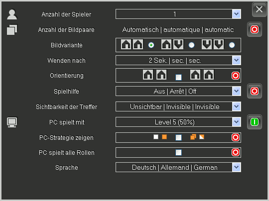 Sichtbarkeit der Treffer. Gefundene Bildpaare können ganz, teilweise oder nicht sichtbar sein. Auch während des Spiels ist ein Umschalten möglich.