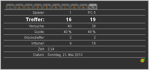 Statistik. In der Statistik werden während des Spiels die Versuche, Treffer, Quote, Glückstreffer, Irrtümer und die Zeit mitverfolgt.